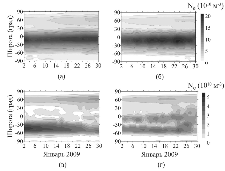 Динамика амплитуды полусуточной компоненты вариаций электронной концентрации существенно разнится в разных версиях модели. В EAGLE-80 по мере развития потепления амплитуда вариаций этой компоненты электронной концентрации в южном полушарии на средних широтах плавно убывает, достигая локального минимума 26 января, тогда как в средних широтах северного полушария отмечается повышение амплитуды (рис. 6в). В случае EAGLE-120 имеет место небольшой рост амплитуды приливных компонент вариаций электронной концентрации в южном полушарии, максимум которых достигается также как и в северном полушарии вблизи максимума ВСП. Важно отметить наличие и усиление полусуточной приливной вариации в приэкваториальной области в версии модели EAGLE-120 (рис. 6г). Это говорит о том, что модель EAGLE-120 воспроизводит значительное усиление полусуточной компоненты вариаций электронной концентрации в приэкваториальной области в период ВСП 2009 г., отмечавшееся как в наблюдениях, так и в результатах моделирования [8, 29].