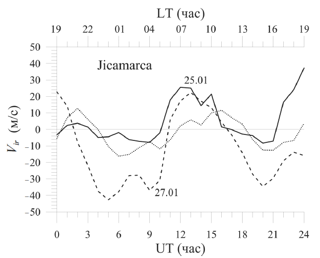 Рис. 7. Поведение вертикальной компоненты скорости электромагнитного дрейфа плазмы Vir в окрестности геомагнитного экватора над станцией Jicamarca (Peru) (12° ю. ш., 76.9° з. д.), рассчитанное в модели EAGLE-120 на высотах F2 слоя ионосферы для спокойных условий в январе 2009 г. (пунктирная кривая) и во время внезапного стратосферного потепления 25 (сплошная кривая) и 27 (штриховая кривая) января 2009 г.