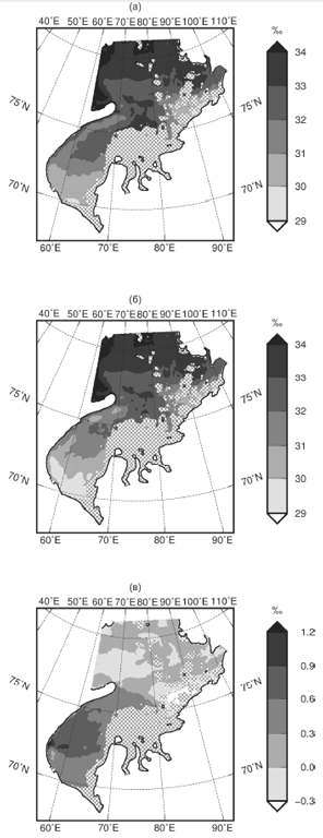 Качественное подобие полей солености морской воды в основании пикноклина сохраняется в северной половине моря (рис. 4). К югу от нее о таком подобии полей солености можно говорить только ориентировочно. Причина — различия значений солености, составляющие 31–32 ‰ при учете приливных эффектов и 30–32 ‰ без их учета в Новоземельской впадине. Соответствующие значения к востоку от нее составляют 32–34 ‰ и 31–33 ‰, а в юго-западной части моря они уменьшаются соответственно до 30 и 29 ‰, в результате чего максимальная разность солености в этих двух случаях обнаруживается к северу от южной оконечности о-вов Новая Земля, где она равна 0.9 ‰ и изменяется от –0.3 до 0.3 ‰ в восточной части моря.
