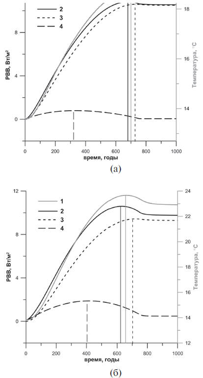 Рис. 3. Зависимость от времени глобальной приповерхностной температуры Tg (кривая 1), суммарного РВВ (кривая 2), РВВ СО2 (кривая 3), РВВ СН4 (кривая 4) в численных экспериментах с КМ ИФА РАН (а) и с концептуальной моделью (б) при ECH4,0 = 720 МтСН4/год и P = 1500 лет.