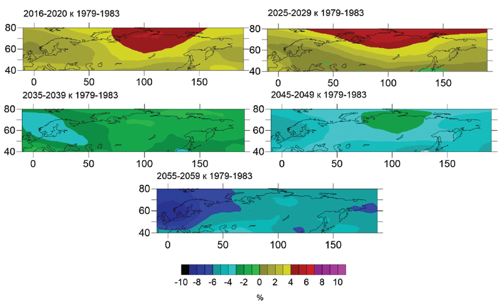 Модельные эксперименты до 2059 г. на основе базового варианта 1А(ТПО-MetOffice), учитывающего только антропогенные выбросы озоноразрушающих веществ, свидетельствуют об отрицательных трендах Qery. Это происходит за счет восстановления озонового слоя в XXI в. согласно действию Монреальского протокола. В 2016–2020 гг. значения Qery в среднем на 2–4% выше значений базового периода (1979–1983 гг.), в полярных районах — на 6%. В 2035–2039 гг. происходит снижение уровня Qery, и в последующие периоды 2045–2049 гг. и 2055–2059 гг. уровни Qery становятся меньше относительно значений 1979–1983 гг. в среднем на 4–6% по всей территории северной Евразии. Наибольшее снижение Qery наблюдается над европейской частью Евразии — на 6–8% относительно базового периода 1979–1983 гг. (рис. 1, 2).