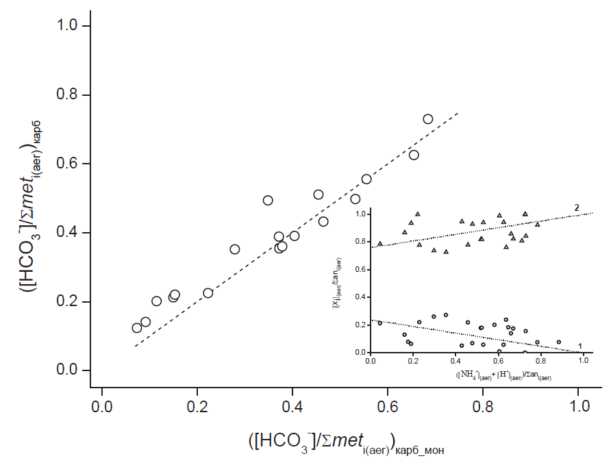 Рис. 1. Графическое соответствие найденных по данным мониторинга и вычисленных из диаграмм «состав–свойство» удельных содержаний гидрокарбонатов в карбонатных аэрозольных частицах. Сухая атмосфера (RH < 0.5). Пунктир отвечает тангенсу угла наклона равного 1. На вставке в координатах «состав–свойство» показана изменчивость по данным мониторинга удельного содержания гидрокарбонатных и кислых анионов в аэрозоле с изменением αNH4_H(aer). Сухая атмосфера. 1:[HCO3(aer)] и 2:[SO4(aer)2]+[NO3(aer)]+[Cl(aer)].