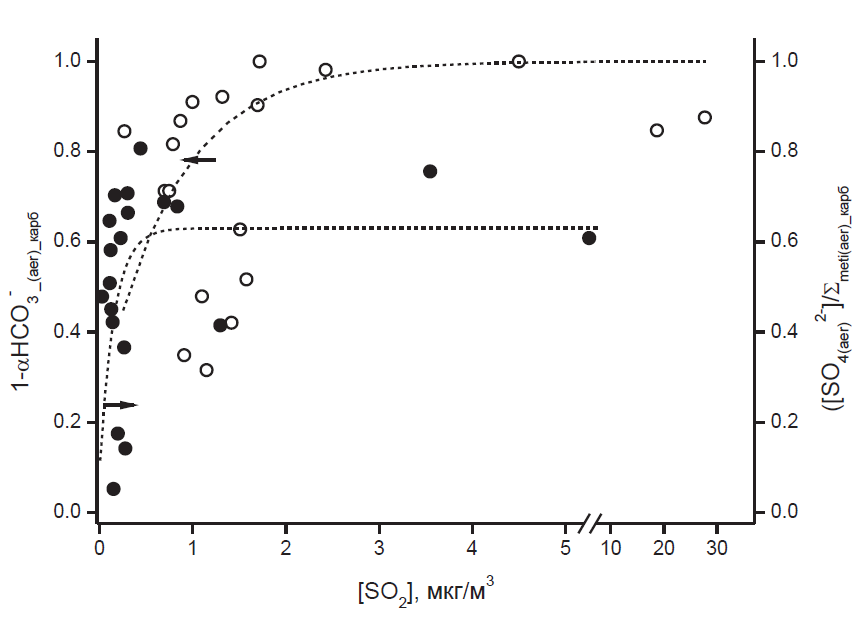 Рис. 2. Влияние концентрации диоксида серы (мкг/м3) на степень конверсии гидрокарбонатных анионов (светлые кружки) и удельного содержания сульфатных (темные кружки) анионов в карбонатных аэрозолях. Сухая атмосфера, αNO3(aer)_карб + αCl(aer)_карб = 0.24 ± 0.1. Пунктир — демонстрационные кривые, отражающие ход αNO3(aer)_карб и αSO4(aer)_карб при вариациях содержания диоксида серы (мкг/м3) в атмосфере.