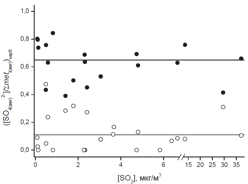 4. Fig. 3. The effect of sulfur dioxide content, µg / m3, on the specific content of hydrocarbonate (light circles) and sulfate (dark circles) anions in carbonate aerosols. Wet atmosphere (RH> 0.8), αNO3 (aer) _carb + αCl (aer) _carb = 0.24 ± 0.1.