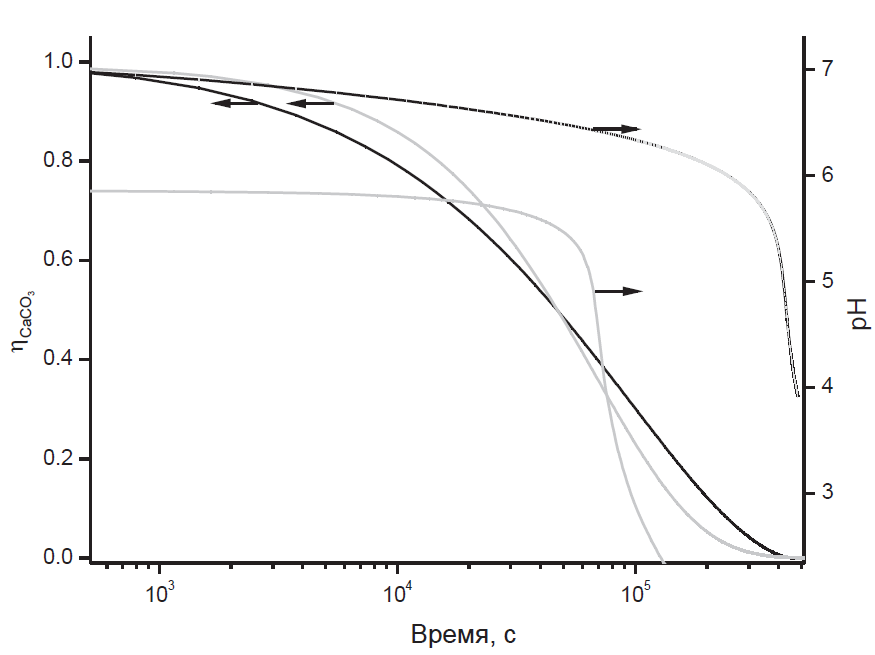 Рис. 4. Расчетные кинетические кривые растворения карбоната кальция и изменения рН водяной пленки карбонатных частиц. Модель Chem WG. Серый и черный цвета, соответственно Т = 286 и Т = 295 К.