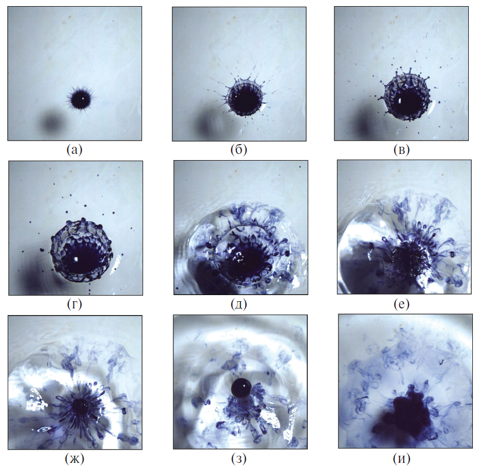 Капли вносят в толщу жидкости растворенные вещества, взвеси и газы, а вылетающие мелкие капельки (брызги) наоборот, выносят в атмосферу минеральные и органические вещества, химически активные соединения и биологические объекты (в частности, вирусы и бактерии, способствующие распространению инфекций [11]). Поскольку интенсивность химических реакций [12] и биологических процессов зависит от характера распределения вещества капли в принимающей жидкости, определяющего эффективную площадь контактной поверхности реагирующих сред, изучение тонкой структуры капельных течений представляет и научный, и прикладной интерес.