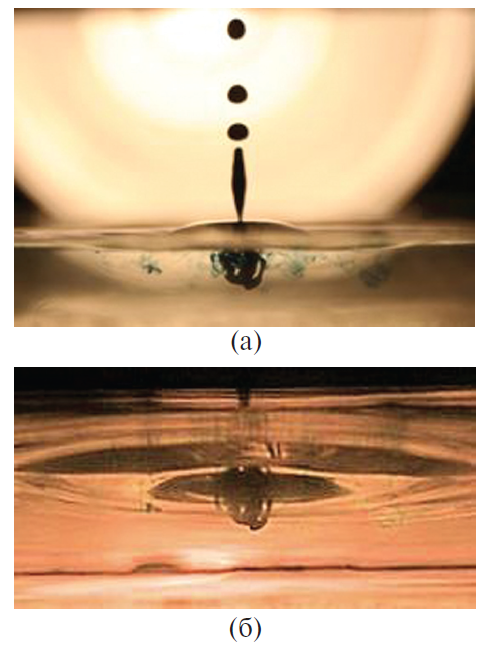 Характер взаимодействия свободно падающей капли с принимающей жидкостью зависит от многих физических факторов — состава сред, размеров, формы и углового положения капли, величины и направления ее скорости в момент контакта, а также характера базовых течений в принимающей среде [13]. Классификация режимов течений приведена в [14].