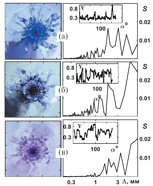 Картины течений, возникающие при падении капель воды, окрашенных ализариновыми чернилами синего, черного или фиолетового цветов, в воду (рис. 4), позволяют проследить влияние вида пигмента. В левой колонке приведены фотографии, а в правой — графики спектров линейных масштабов, рассчитанные по флуктуациям освещенности вдоль выделенной дуги, также показанной на фотографиях. Спектры на рис. 4 даны в полулогарифмической шкале, позволяющей выделить малоконтрастные вариации в распределении красителя.