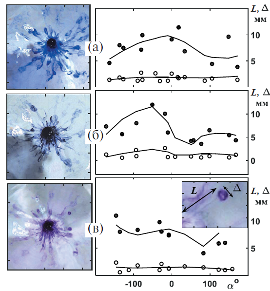 Вариабельность длин окрашенных микроструек L отражает неравномерность распределения механической энергии в центральной области течения и кратковременность процессов их формирования. Сложная геометрия течения указывает на многообразие процессов, одновременно влияющих на перенос вещества в области падения капли.