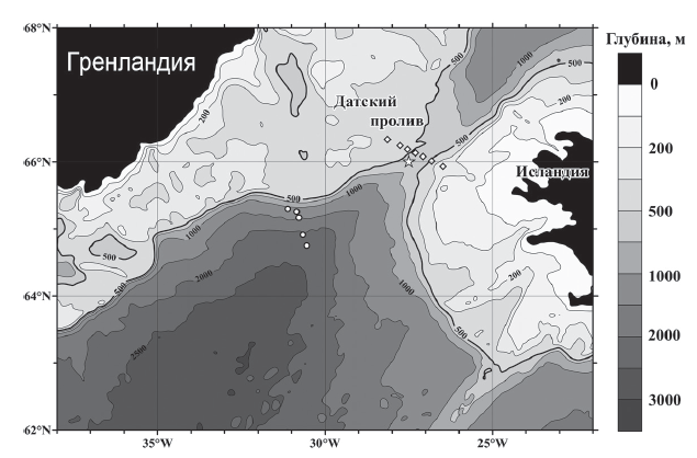 В июле 2018 г. в Датском проливе были проведены работы по исследованию перетока арктических вод в Атлантику и водообмена между двумя океанами. Проводились CTD/LADCP-зондирования зондом SBE911 и парой профилографов течений RDI QM 150 kHz (down-looking) и WHS300 kHz (up-looking). Кроме того, была установлена буйковая станция с измерителями разного типа. Карта района работ показана на рис. 1. Задачей работы является дать оценку амплитуд внутренних волн в районе Датского пролива.
