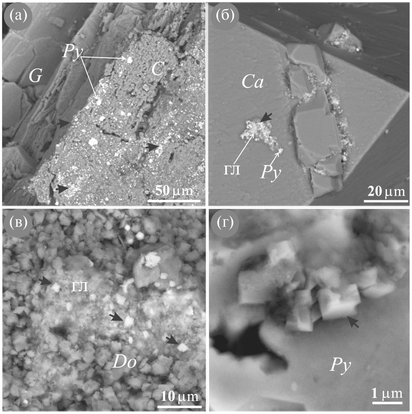 Рис. 1. Форма проявления титановых фаз (показаны стрелками) в терригенно-карбонатной (а) и верхней части соляно-мергельной толщ (б–г): а — оксид титана и зерна пирита (Py) на поверхности псевдоморфозы халцедона (C) по прожилку гипса (G); б — выделения пирита и оксида титана в глине (гл) на поверхности кристалла кальцита (Ca); в, г — пинакоидальные индивиды анатаза в глине на поверхности доломитового (Do) агрегата (в) и на поверхности кристалла пирита (г).(