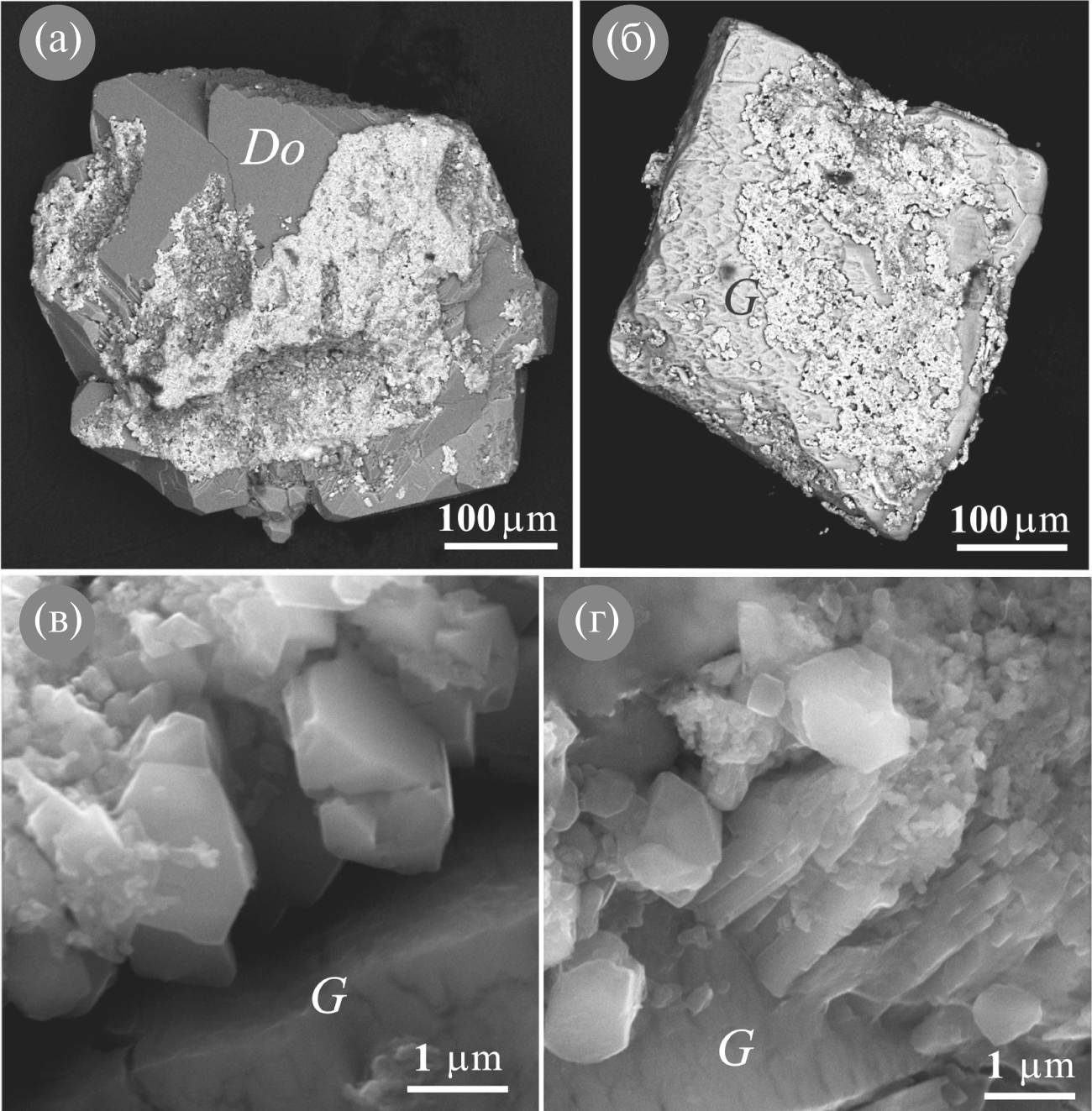 Рис. 2. Кристаллы анатаза из нижней части соляно-мергельной толщи: а, б — оторочки на кристаллах доломита (Do) и гипса (G); в, г — оторочки, сложенные нормальными (в) и вытянутыми вдоль оси второго порядка (г) кристаллами, на поверхности индивидов гипса.