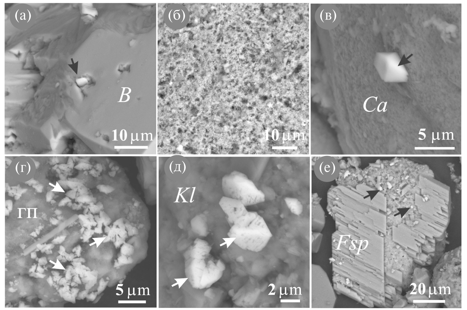 Рис. 3. Оксиды титана (показаны стрелками) из покровной каменной соли (а) и карналлитовой зоны (б–е): а — пинакоидальный вросток анатаза в борате (B) ряда эрикаит–чемберсит; б — тонкодисперсная «сыпь» оксида титана на галопелите (гп); в–е — дипирамидальные кристаллы на поверхности вторичного кальцита (Ca), галопелита (гп), каолинита (Kl) и калиевого полевого шпата (Fsp).