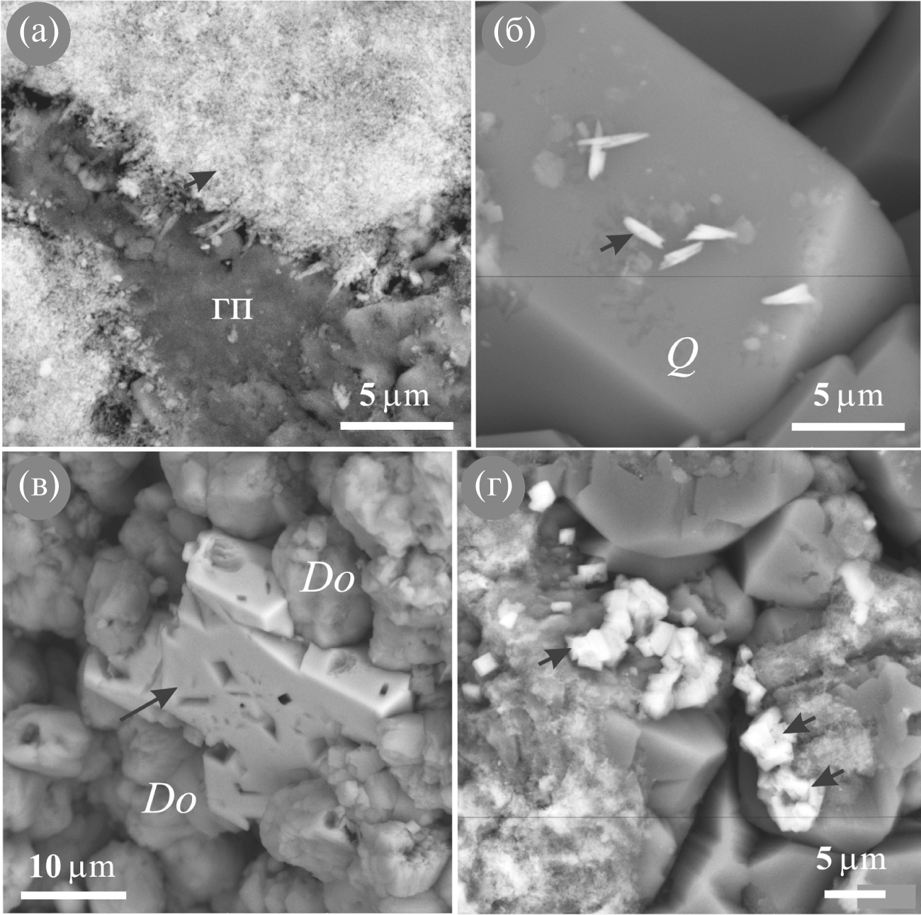 Рис. 4. Оксиды титана (показаны стрелками) из сильвинитовой зоны (а) и верхней части подстилающей каменной соли (б–г): а — тонкодисперсный оксид титана с иглами рутила на галопелите (гп); б — рутил на кварце (Q); в — анатаз на доломите (Do); г — анатаз на пирит-доломит-кальцитовой псевдоморфозе по ангидриту.