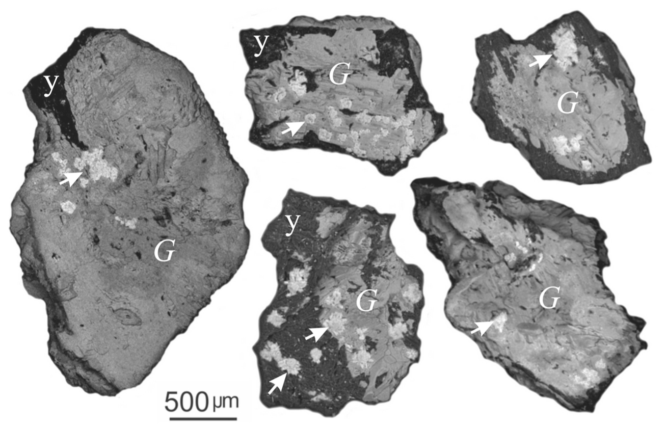 Рис. 5. Агрегаты оксидов титана (показаны стрелками) на поверхности частиц углистого детрита (у), частично покрытых гипсовой оторочкой (G), из средней части подстилающей каменной соли