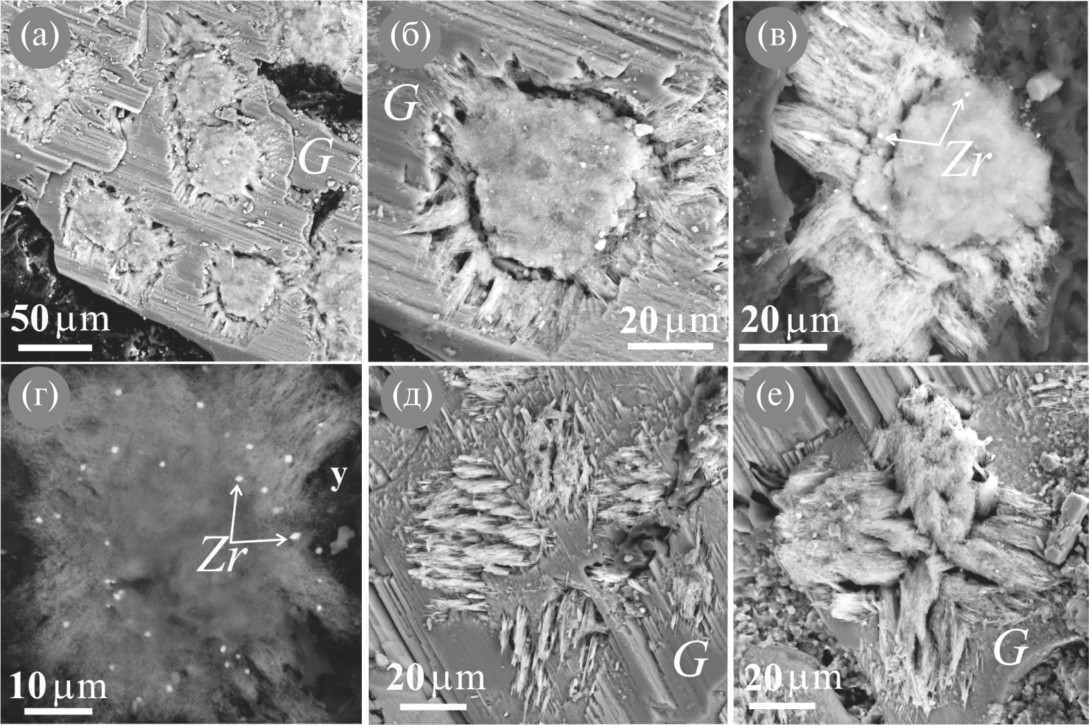 Рис. 6. Зональные агрегаты оксидов титана, состоящие из тонкодисперсного рыхлого ядра, обросшего иглами рутила в виде шестилучевой (а, б), четырехлучевой (в, г) и восьмилучевой (д, е) звезды. G — гипс, у — углистый детрит, Zr — циркон.
