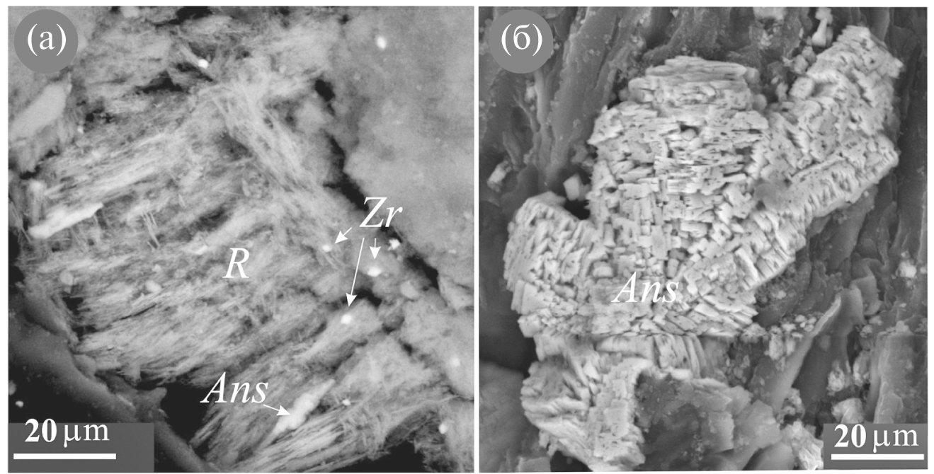 Рис. 7. Индивиды и агрегаты анатаза из средней части подстилающей каменной соли: а — веретенообразные индивиды (Ans) среди иголок рутила (R) и микрокристаллов циркона (Zr); б — блочные агрегаты анатаза, обросшие шестилучевой агрегат рутила.