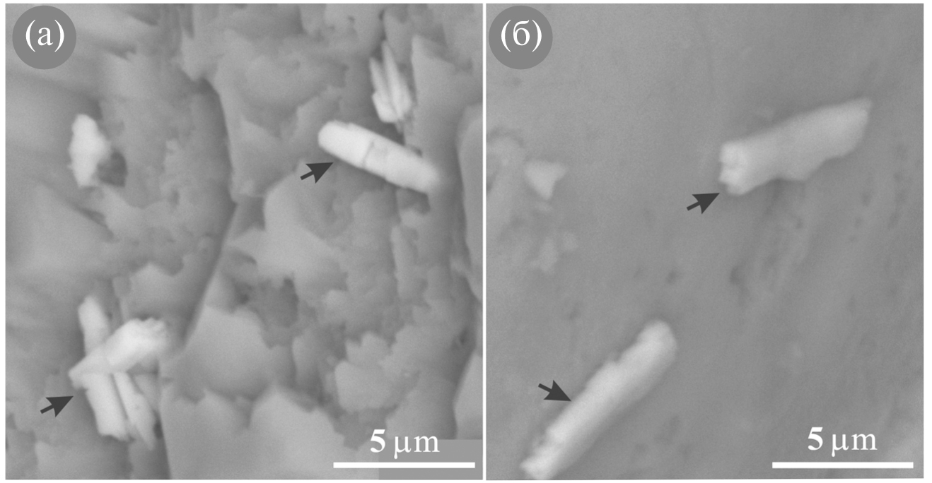 Рис. 8. Кристаллы рутила (показаны стрелками) из средней части подстилающей каменной соли на регенерированном альбите (а) и вторичном кальците (б).