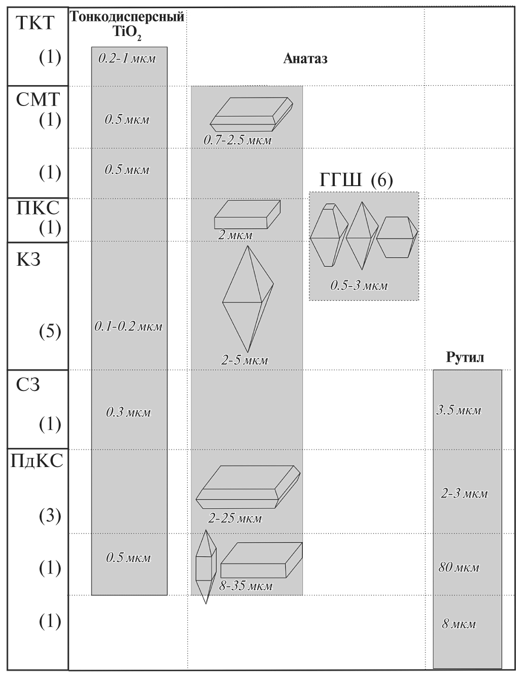 Обзор современных экспериментальных данных и технологий показал (Hanaor, Sorrell, 2011), что на фазовый переход анатаза в рутил могут влиять и другие элементы. Так Ba, Sr, Ca, TR, Al, Zr, Si, Nb, P, Mg, F, NH4+, CO32- выступают в качестве ингибиторов и блокируют этот переход, а О, Li, B, Na, K, Fe, Ni, Mn, Cr, Co, Cu, Zn, Cd и Sn — активизируют (промоутеры). О влиянии Fe2О3 на устойчивость рутила писал также Н.В. Белов (1954). Эти данные позволяют предполагать, что свою лепту в устойчивость анатаза могут вносить как компоненты минералообразующей среды (Ca, Mg, CO32-), так и примеси (Al, Zr, Si). Для рутила такими элементами могут быть О, Na, K, Fe, Cr. Однако фиксируемый в исследуемых фазах практически одинаковый набор примесей (Al, Si, V, Cr, Fe, Zr в анатазе и Al, Si, V, Fe, Zr в рутиле) отражает не столько их влияние на фазовую устойчивость оксидов титана, сколько геохимическую специализацию исходного алюмосиликатного материала. Более высокие содержания примесей в анатазе по сравнению с рутилом могут являться результатом кристаллизации первого из «загрязненного» включениями тонкодисперсного коллоидного агрегата, а второго (с более компактной кристаллической решеткой) — за счет трансформации первого, идущей с очищением от примесей.