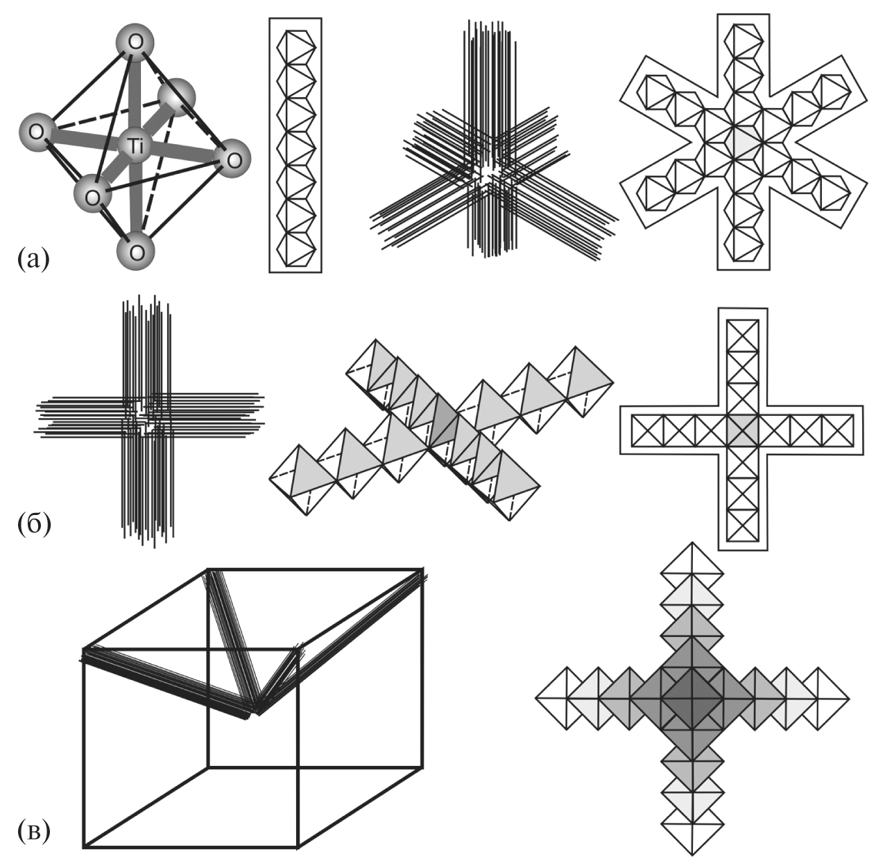 Рис. 10. Структурные мотивы кристаллов рутила и соответствующие им типы двойникования в солях Верхнекамского месторождения: а — октаэдр TiO6, цепочка октаэдров и их «коленчатое» двойникование по Н.В. Белову (1954); б — двойникование крестом; в — двойникование трехмерной восьмилучевой звездой.