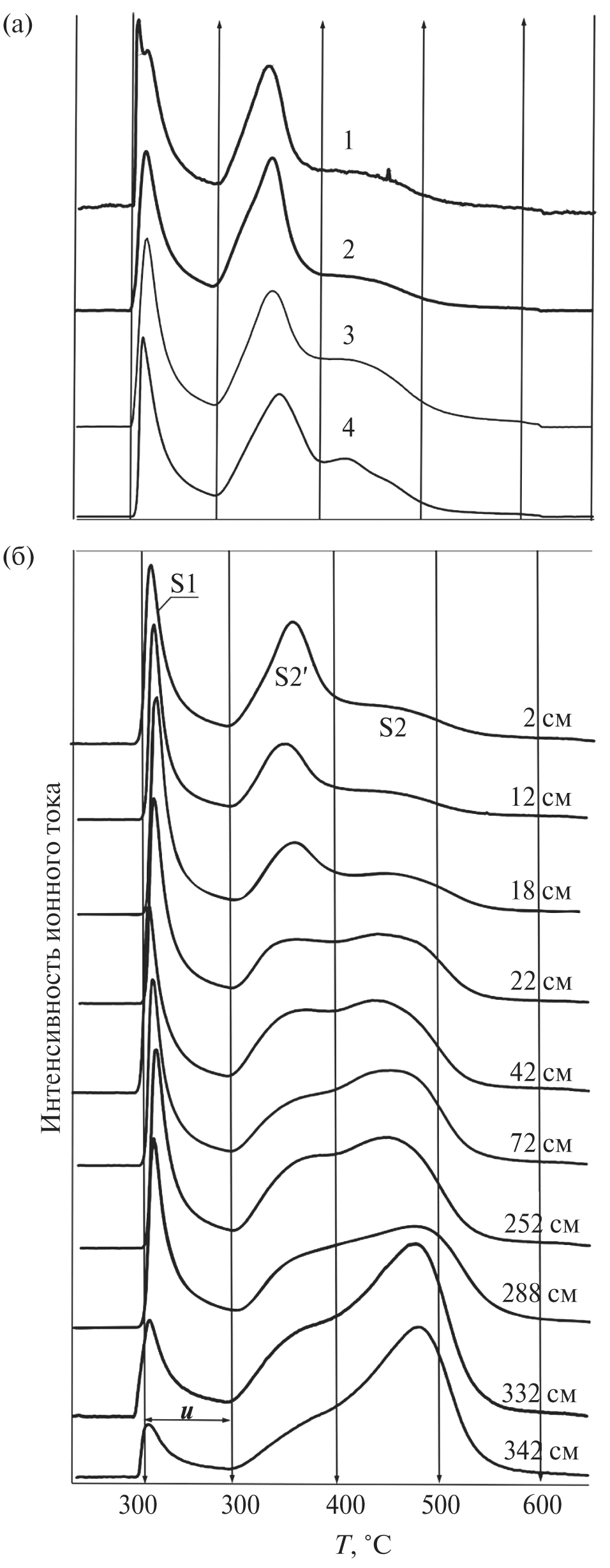 Рис. 2. Пирограммы: а — первичных продуцентов 1 — сфагновый мох (мочажина), 2 — сфагновый мох (подушка), 3 — зеленые мхи, 4 — клюква; б — образцов торфа изученного разреза (цифрами показаны глубины отбора образцов); и — изотермическая ступень пиролиза (300 оС); остальные пояснения в тексте.