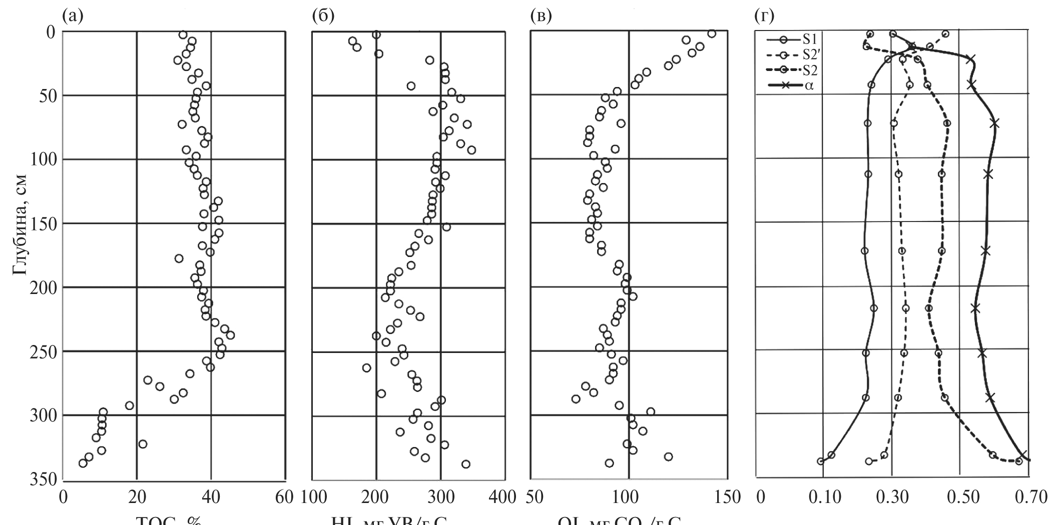 Рис. 3. Профиль изученного разреза торфа по данным пиролиза: а, б, в — изменение по глубине общего содержания органического углерода (ТОС), водородного (HI) и кислородного индекса (OI) соответственно; г — величины относительных площадей пиков (S1, S2ʹ, S2), степени превращения торфа (α), рассчитанных из пирограмм образцов осадков.