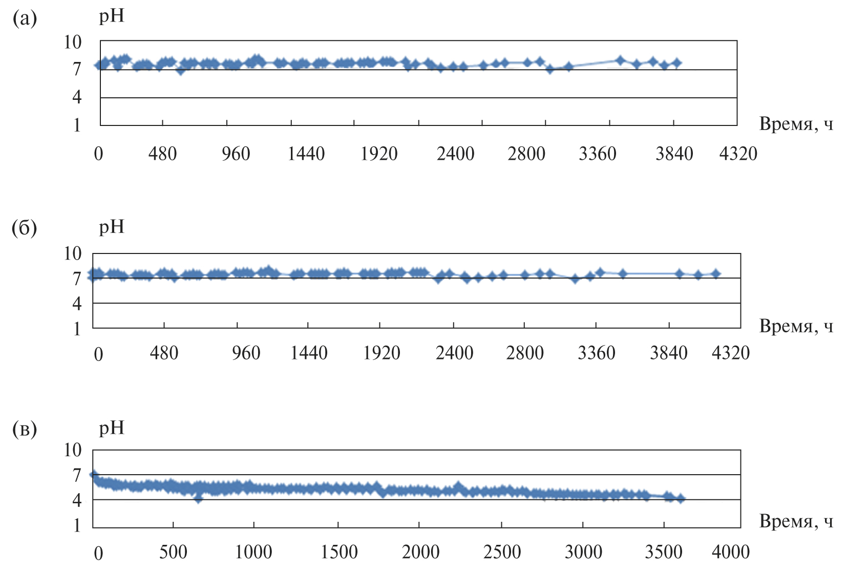 Рис. 1. Изменение рН в ходе эксперимента раствор–порода: а — гарцбургитовый серпентинит SeDr 3-2-1; б — карбонатизированный гарцбургитовый серпентинит SeDr 5-1-4; в — базальт (Wood et al., 2008).