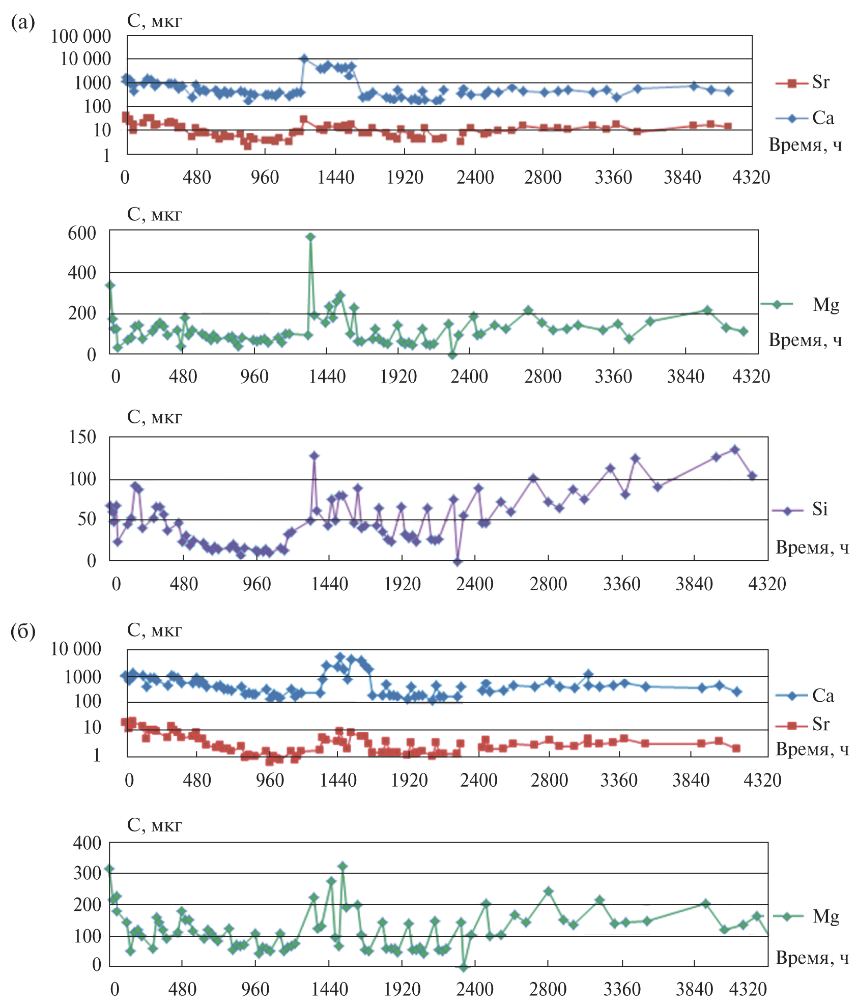 Элементный состав элюата в случае серпентинита также оставался достаточно стабильным на протяжении всего эксперимента. Значимые концентрации были отмечены для Ca, Mg, Si, Sr, Ni, Cu, S и Fe (некоторые кривые приведены на рис. 2). На начальном этапе (первые дни) наблюдалось несколько более высокое содержание Mg и S (что отражает растворение более тонкодисперсного материала и реакции на дефектах кристаллической структуры, а также переход в раствор сульфатных форм серы).