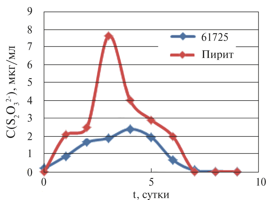 Дальнейший переход серы в раствор связан, вероятно, с окислением сульфидных минералов и образованием целого ряда промежуточных форм, в том числе тиосульфат-иона (Schippers et al., 1999). На рис. 3 показана кинетика образования тиосульфат-иона, прослеженная в модельном эксперименте при взаимодействии тонкоизмельченного пирита с водой. Можно видеть, что тиосульфат-ион обнаруживается в растворе с первых часов взаимодействия компонентов системы (данные получены методом ионной хроматографии).
