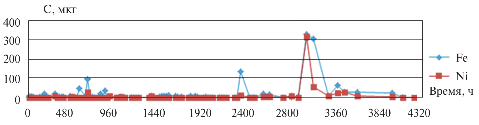 Рис. 4. Выходные кривые железа и никеля в эксперименте раствор–серпентинит SeDr 5-1-4. 1 Скорее, имеет место сорбционное взаимодействие образующихся гидроксокомплексов палладия с оксигидроксидами железа.