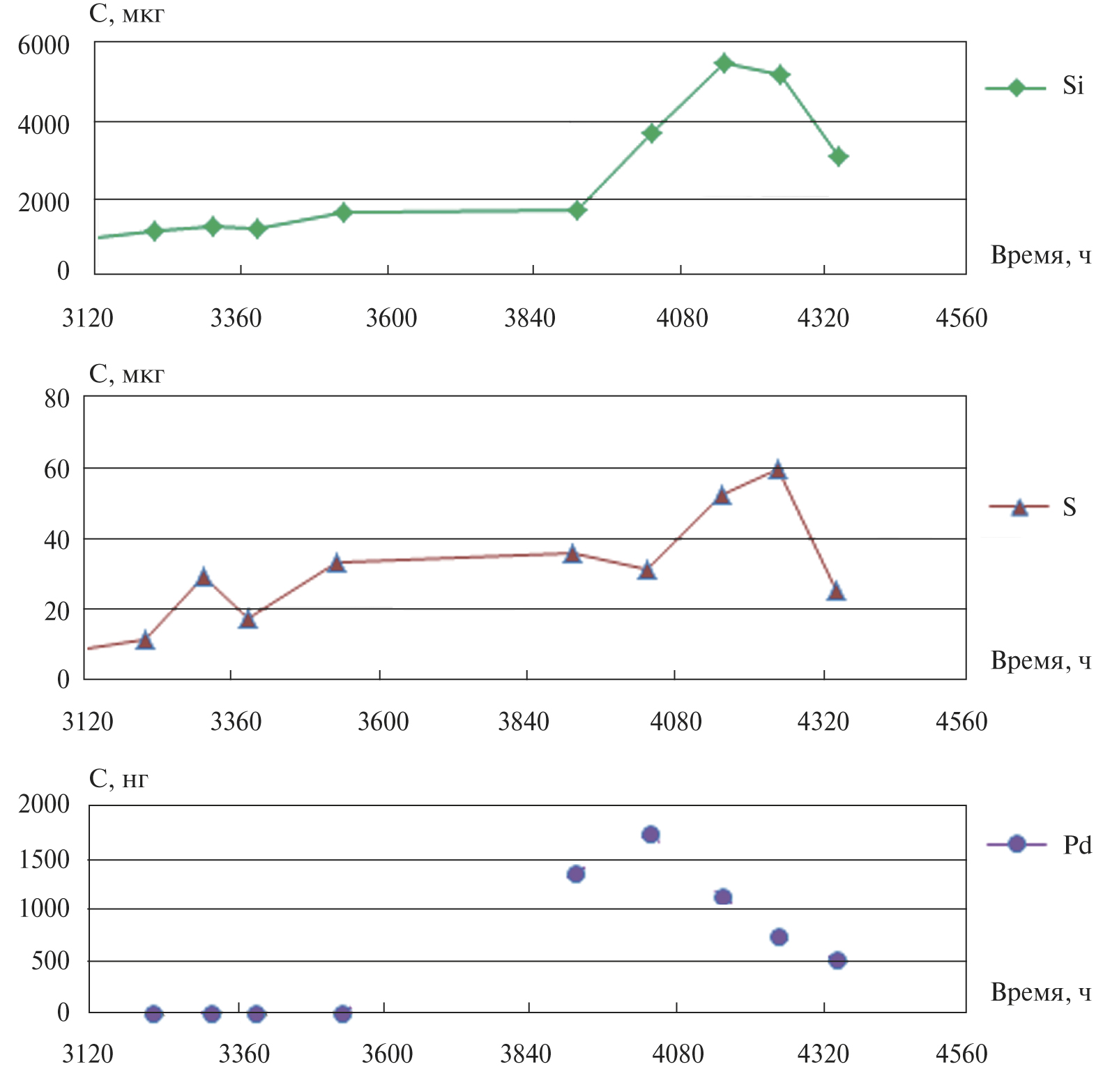 Рис. 5. Фрагмент выходной кривой кремния, серы и палладия во фракциях в эксперименте раствор–серпентинит SeDr 3-2-1.