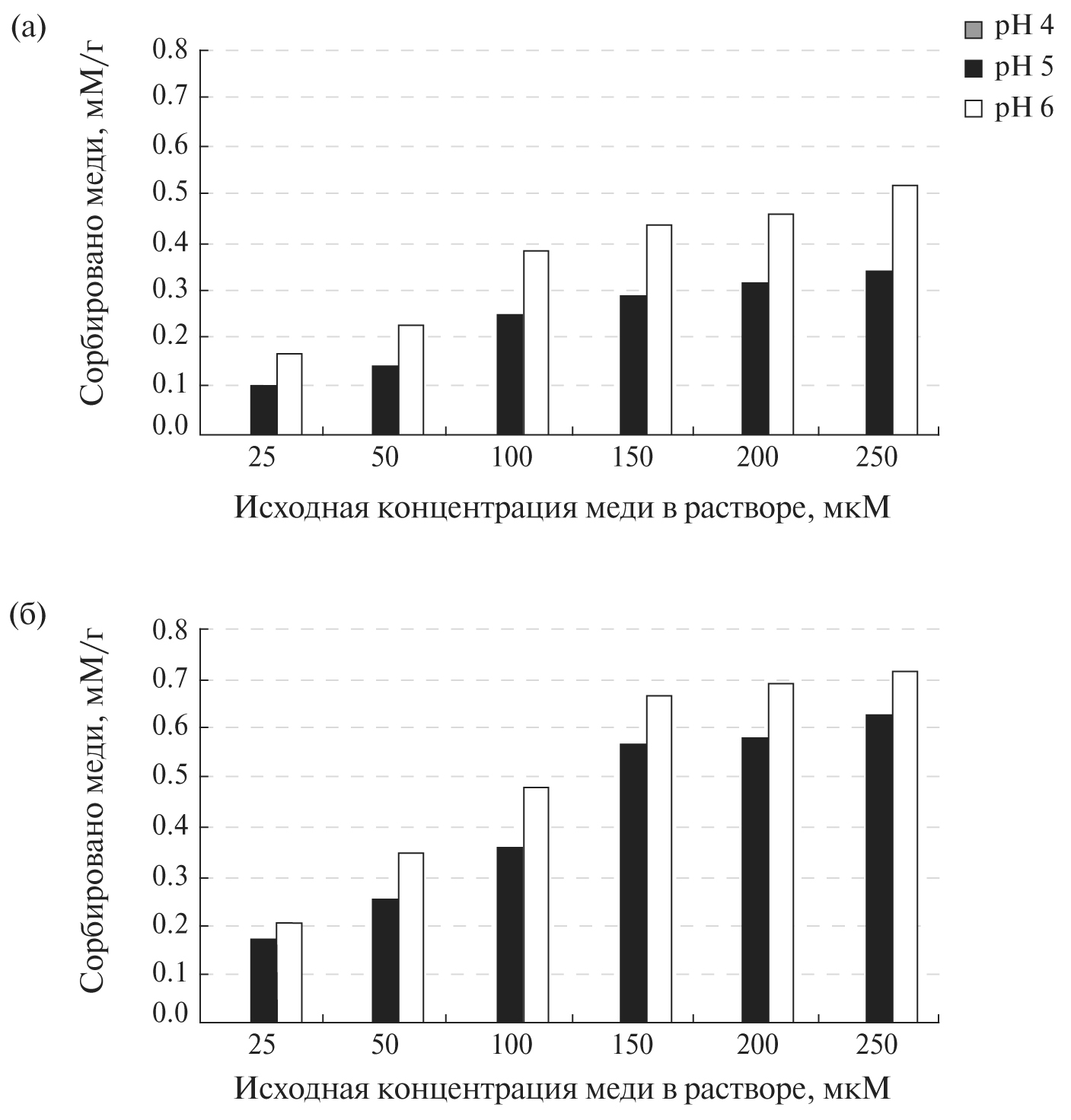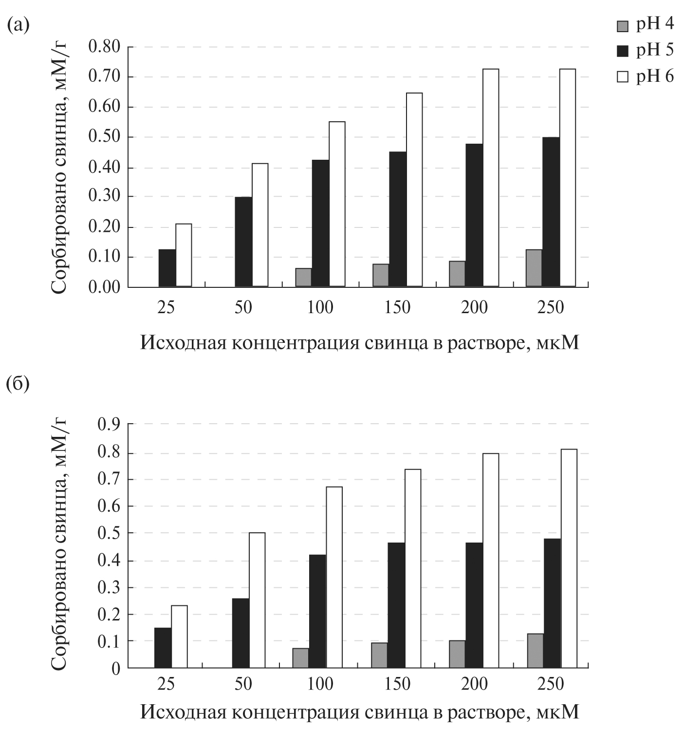 При рН 4 сорбционного раствора мы не наблюдали биосорбции меди живыми и разрушенными клетками, а биосорбция свинца происходила при внесении доз элемента 100 мкМ и выше. Очевидно, в данных условиях кислая среда не позволяла катионам микроэлементов конкурировать с протонами за сорбционные центры. Максимальная биосорбция свинца живыми клетками достигала 0.5 мМ/г при рН 5 и 0.72 мМ/г при рН 6 (рис. 1а). При рН 4 и рН 5 поглощение свинца живыми и разрушенными клетками практически не различалось, но при рН 6 биосорбция элемента обломками клеток превосходила их поглощение живыми клетками и достигала при максимальных концентрациях свинца в растворе 0.81 мМ/г (рис. 1б). Факты большей сорбционной емкости мертвых клеток подтверждаются литературными данными (Li et al., 2010; Huang et al., 2013 и др.). Очевидно, что при разрушении клеток в сорбционный процесс включаются как внутренние части клеточных оболочек, так и некоторые внутриклеточные структуры. За счет этого происходит увеличение количества и разнообразия функциональных групп и сорбционных центров, задействованных в поглощении микроэлементов (Fu, Viraraghavan, 2002; Li et al., 2010).