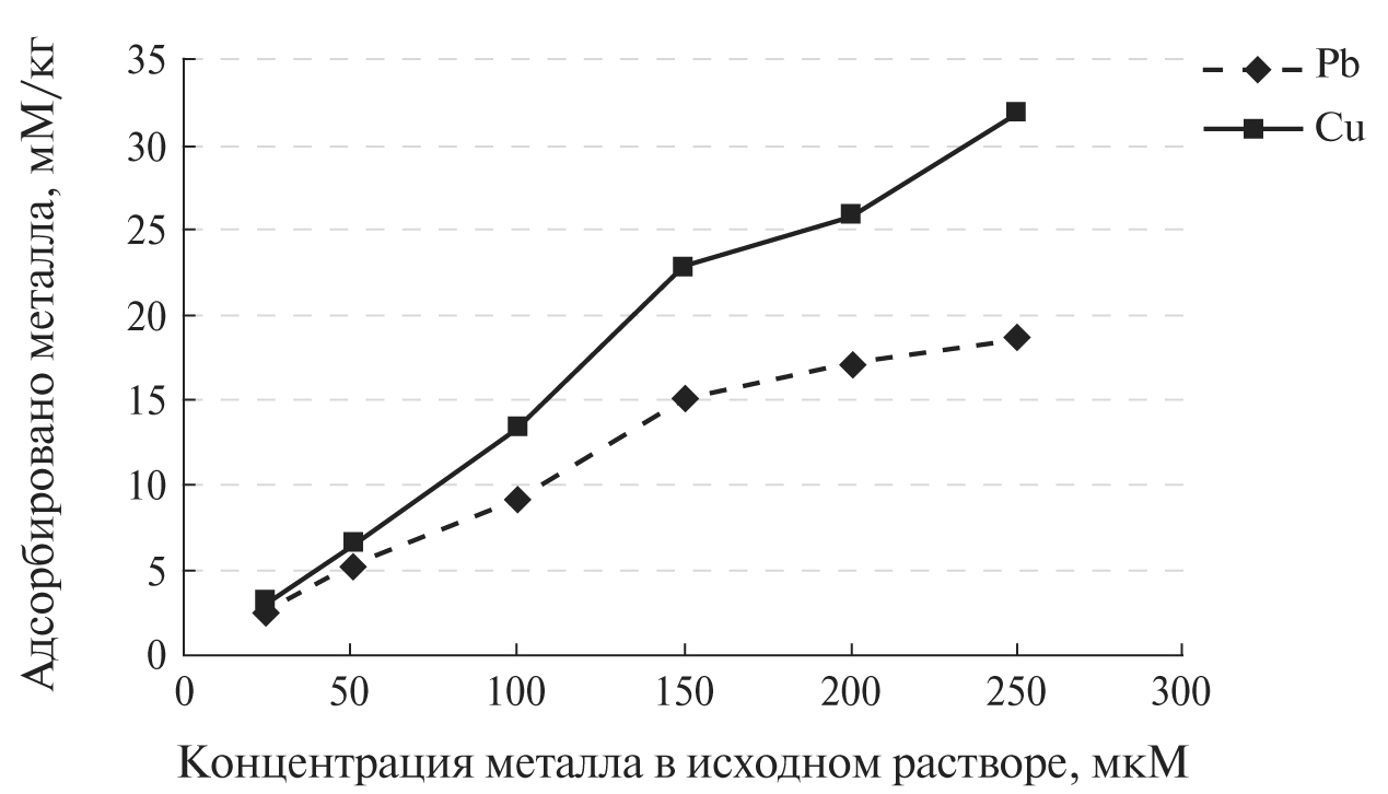 Поглощение свинца и меди кальциевым бентонитом в диапазоне концентраций 25–250 мкМ при рН 5 изображено на рис. 3. Сравнение величин адсорбции Pb и Сu бентонитом, а также живыми и разрушенными клетками (рис. 1 и 2) свидетельствует о том, что биологический материал является более эффективным сорбентом (на порядок и более). Поглощение микроэлементов снижается в ряду: