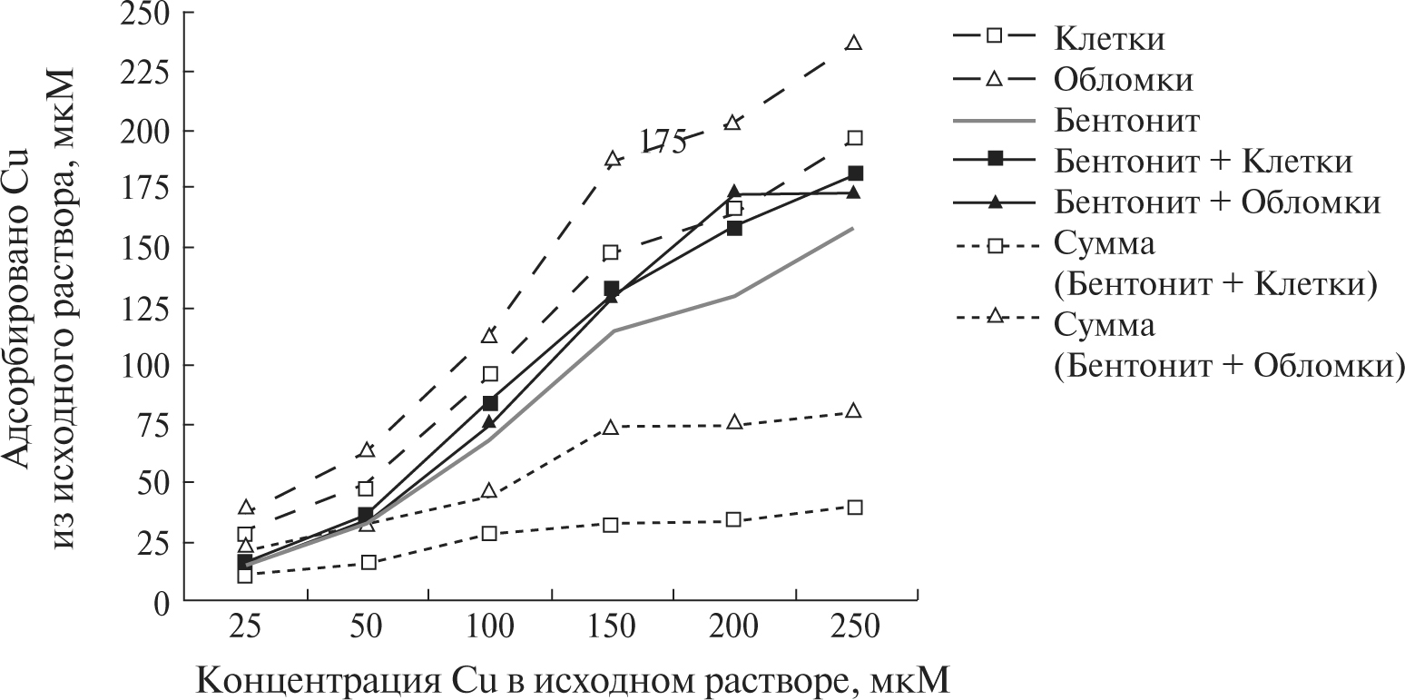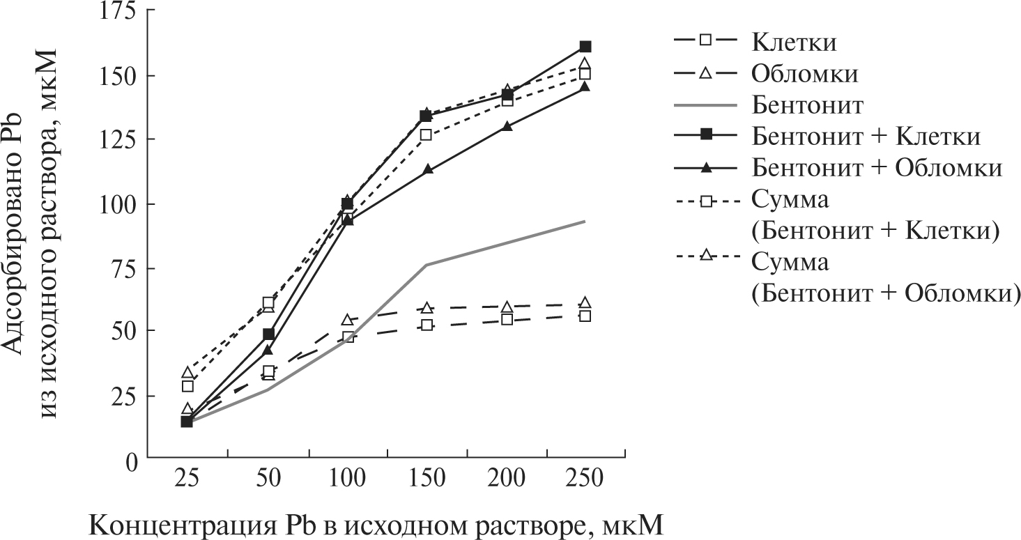 В трехкомпонентных биокосных системах, включающих бентонит и клетки бактерий или бентонит и обломки клеток, происходит увеличение поглощения изученных микроэлементов по сравнению с бентонитом. При этом поглощение смесью бентонита и обломков клеток было ниже, чем аддитивно рассчитанное аккумулирование микроэлементов индивидуальными компонентами как для свинца, так и для меди при всех изученных концентрациях. Аналогичная закономерность наблюдалась для системы из живых клеток и бентонита для меди и живых клеток и бентонита для свинца при его низком содержании в сорбционном растворе.