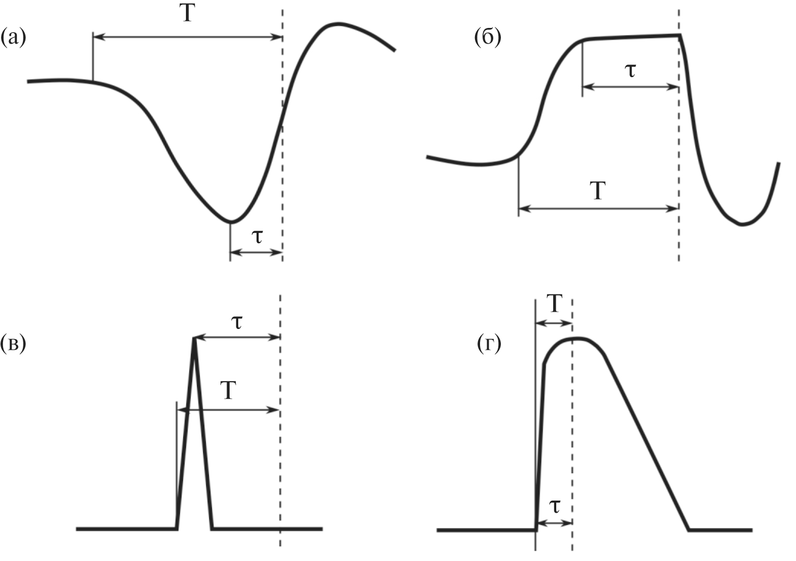 Рис. 3. Основные типы гидрогеохимических предвестниковых эффектов: а – бухтообразные, б – ступенчатые, в – импульсные, г – скачкообразные. T – время предвестника, τ – время экстремума (перегиба кривой) предвестника. Пунктирной линией обозначен условный момент землетрясения (Kissin, Grinevsky, 1990; Киссин, 1997; Рябинин, Хаткевич, 2008; Рябинин, Кузьмин, 2012).