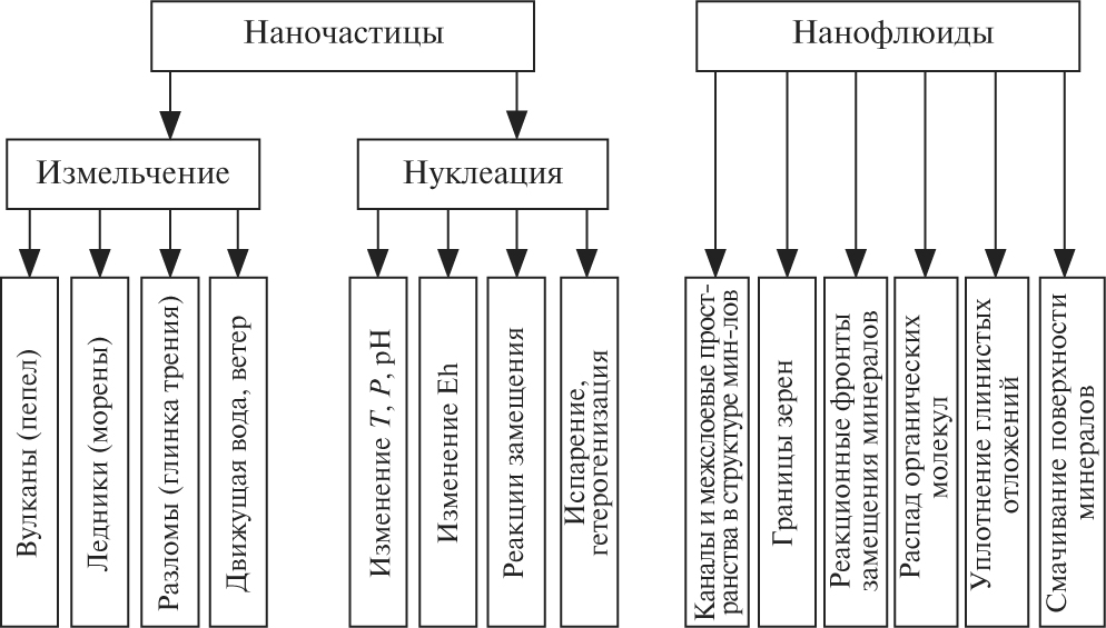 Наночастицы образуются двумя путями: 1) измельчением объемных фаз и 2) через зародышеобразование (рис. 1). Первый путь реализуется вулканами, разломами и физическим выветриванием. Вулканы являются основным поставщиком наночастиц в атмосферу в виде пепла (Ermolin et al., 2018; Shkinev et al., 2016). Эти наночастицы с высоким содержанием нормируемых элементов способны долго удерживаться в атмосфере и, отражая солнечный свет, понижать температуру земной поверхности в региональном и даже планетарном масштабе. При движении блоков земной коры по разломам образуется глинка трения с большой удельной поверхностью, которая поглощает значительную долю энергии землетрясений (Wilson et al., 2005). Ледники, сползая с гор, истирают склоны. Ветровая пыль, айсберги, ледники и ледниковые воды переносят наночастицы гидроксидов железа в океан и тем самым повышают его биологическую продуктивность (Prospero, Lamb, 2003; Raiswell et al., 2006).