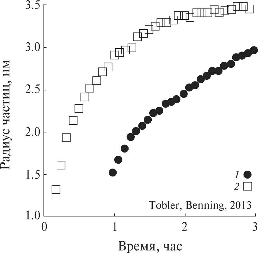 Рис. 2. Увеличение радиуса зародышей SiO2 со временем при одинаковом начальном пересыщении раствора (Q/K = 5), которое создавалось уменьшением температуры (1) и рН (2). Данные из (Tobler, Benning, 2013).