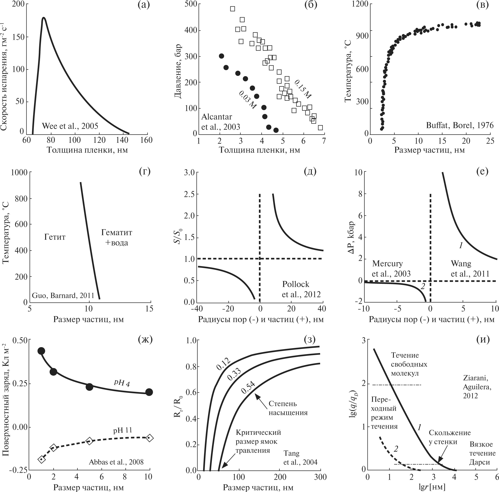 Рис. 4. Размерные зависимости свойств наночастиц и нанофлюидов: (а) – скорость испарения воды на краю мениска при разности температур стенки и пара 0.1°К (модель); (б) – давление на пленку раствора, расположенного между пластинками слюды, при разных концентрациях NaCl; (в) – температура плавления золота; (г) – граница полей стабильности гетита и гематита; (д) – относительная растворимость пор и частиц кварца по уравнению (14) при γ = 0.35 Дж/м2 (S и S0 – растворимость для кривой и плоской поверхности); (е) – разность давлений по уравнению (15) для твердых наночастиц при γ = 1 Дж/м2 (1) и для воды, расположенной в нанопорах, при γ = 0.072 Дж/м2 (2); (ж) – поверхностный заряд на гетите при разных рН; (з) – отношение скоростей растворения нано- и макрочастиц апатита при разной степени насыщения раствора; (и) – отношение фактического потока к потоку, вычисленному по закону Дарси, для метана (1) и воды (2). Ссылки на рисунках – источники данных для построения графиков.
