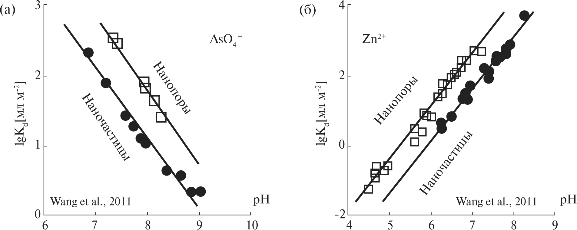 Рис. 5. Зависимости констант сорбции AsO4- (а) и Zn2+ (б) на поверхности наночастиц и нанопор глинозема от рН (Wang et al., 2011).