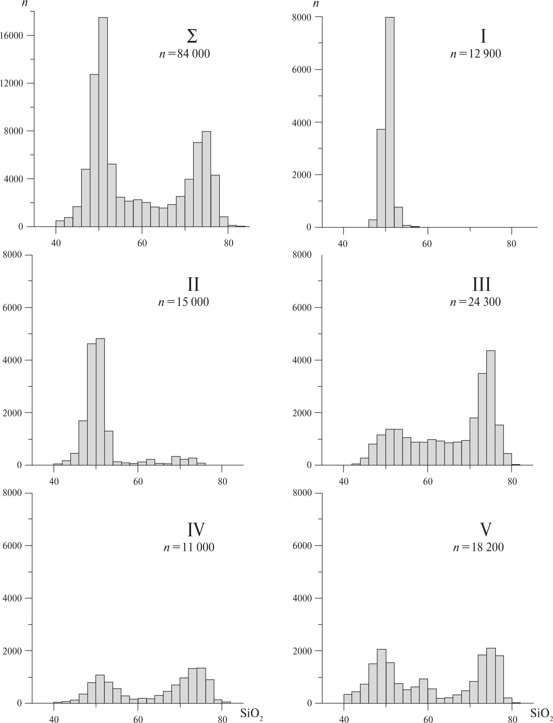 На рис. 1 представлены гистограммы распределения содержаний SiO2 в гомогенных расплавных включениях в минералах и в закалочных стеклах вулканических пород. Количество определений для всех геодинамических обстановок достигло 84 000 (на рис. 1 обозначено как ∑). Отчетливо видна бимодальность распределения содержаний SiO2 в природных магматических расплавах. Первый максимум определений приходится на содержания SiO2 = 50–52 мас.%, а второй – на содержания 72–76 мас.%. Минимальное количество определений приходится на содержания SiO2 = 62–66 мас.%. Расплавы основного состава (SiO2 <54 мас.%) характерны во всех геодинамических обстановок. В нашей предыдущей работе (Наумов и др., 2017) были рассмотрены только расплавы основного состава. Для каждой геодинамической обстановки средние содержания элементов и доверительные интервалы впервые были рассчитаны в 3 вариантах: для расплавных включений в минералах, для закалочных стекол пород и совместно по всем данным. На рис. 1 видно, что расплавы кислого состава (SiO2 >66 мас.%) в значительном количестве характерны только для геодинамических обстановок III, IV и V. Расчету средних содержаний летучих, петрогенных и редких элементов в магматических расплавах кислого состава и посвящена настоящая работа.