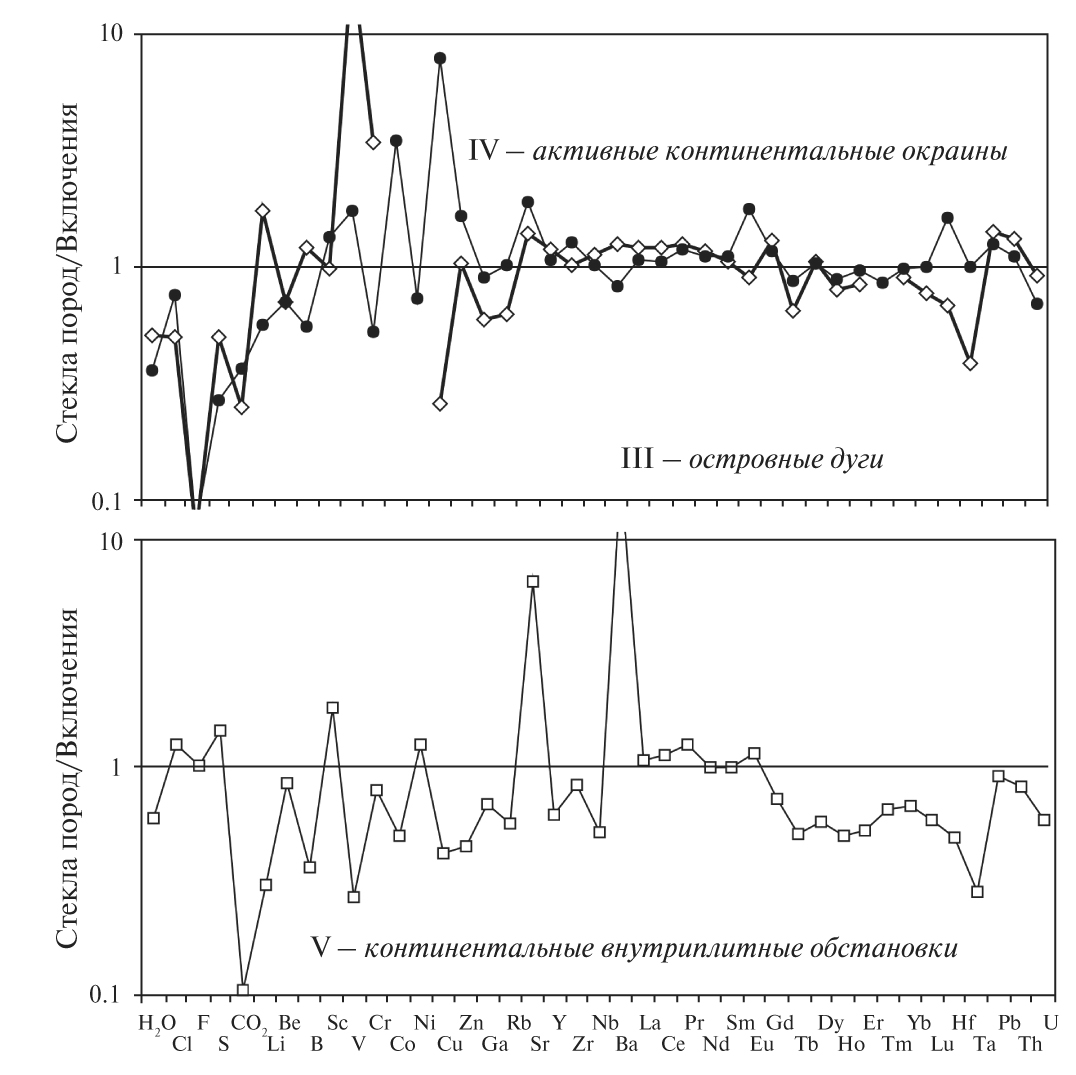 Рис. 2. Отношения содержаний элементов в стеклах и включениях кислого состава из геодинамических обстановок III–V.