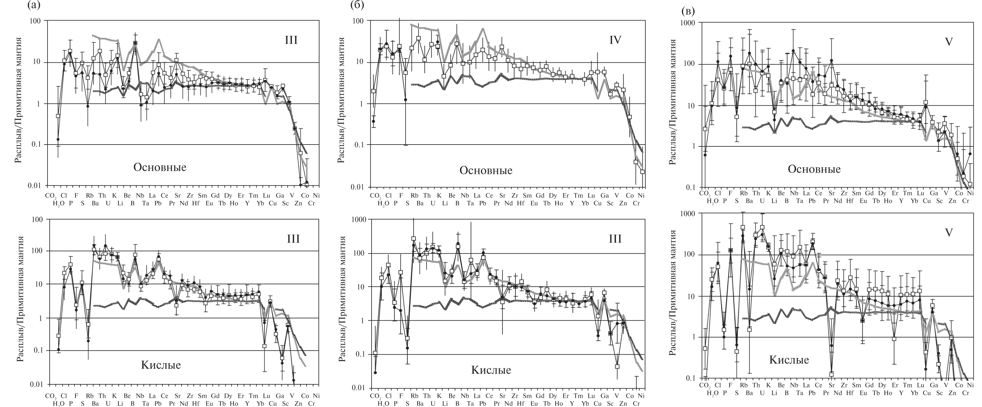 На рис. 3 показаны составы кислых и основных расплавов, нормированные к содержаниям элементов в примитивной мантии (Palme, O’Neill, 2014). Составы кислых расплавов обстановок III и IV близки друг к другу и повторяют основные черты, отмеченные для основных расплавов (Наумов и др., 2017). Общий уровень содержаний элементов в кислых составах заметно выше, чем в основных, и очень близок к среднему составу континентальной коры (Rudnick, Gao, 2014), превышая этот уровень только для наиболее некогерентных литофильных элементов. Отметим отрицательные аномалии Sr, Eu (фракционирование плагиоклаза) и S (отделение сульфида) в кислых составах, которые не наблюдались в основных расплавах. Близкие геохимические характеристики кислых и основных расплавов позволяют предполагать единый генезис, т.е. образование кислых расплавов за счет кристаллизационной дифференциации основных, либо при частичном плавлении продуктов кристаллизации основных расплавов.
