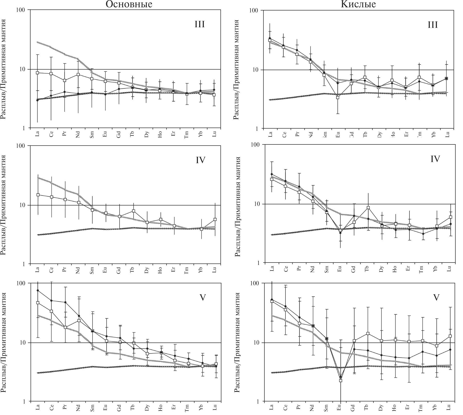 Распределение элементов в стеклах и включениях из внутриплитных пород (обстановка V) носит специфический характер. Отметим, прежде всего, что как основные, так и кислые расплавы характеризуются существенным обогащением по сравнению с расплавами из других обстановок и составом континентальной коры. В отличие от обстановок III и IV, кислые и основные составы обстановки V заметно различаются по характеру распределения редких элементов (рис. 4). Для основных составов наблюдается практически линейное увеличение содержаний РЗЭ от тяжелых к легким. В кислых расплавах тяжелые и средние РЗЭ характеризуются плоским распределением, в то время как содержания легких РЗЭ заметно повышены. В этом отношении кислые расплавы обстановки V напоминают составы обстановок III и IV, но при более высоких содержаниях тяжелых РЗЭ. Таким образом, основные и кислые расплавы обстановки V, скорее всего, не связаны общим источником. Основные расплавы с высокими содержаниями редких элементов и сильно фракционированными спектрами РЗЭ могут быть продуктами невысоких степеней плавления мантии в поле стабильности граната. Кислые расплавы образовывались из источника, близкого по составу к континентальной коре. Равномерное обогащение тяжелыми и средними РЗЭ может свидетельствовать о значительной роли амфибола в образовании кислых расплавов, поскольку распределение амфибол-расплав характеризуется как раз близкими и высокими коэффициентами распределения тяжелых РЗЭ и значительным понижением коэффициентов распределения к легким РЗЭ (Nandedkar et al., 2016).