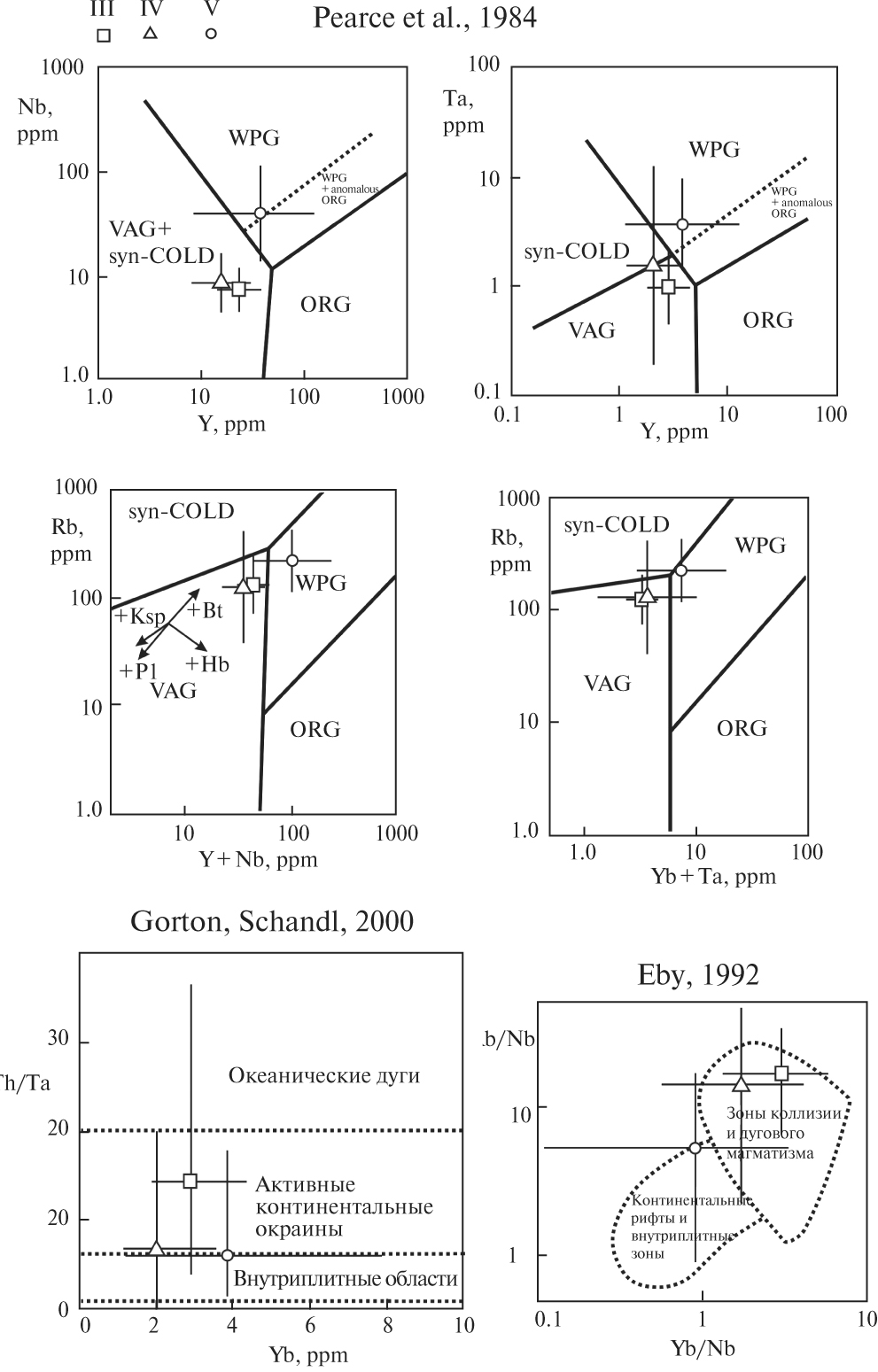 Рис. 5. Средние составы кислых (совместно стекла и включения) расплавов на дискриминантных диаграммах, используемых для определения геодинамической природы кислых вулканических пород и гранитоидов. Условные обозначения: WPG – внутриплитные граниты, VAG – граниты островных дуг, ORG – граниты срединно-океанических хребтов, syn-COLG – синколлизионные граниты. III– V – геодинамические обстановки.