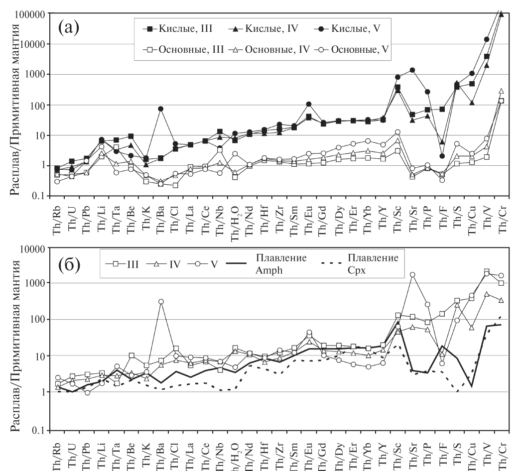Рис. 6. Вариации средних отношений редких элементов в кислых и основных расплавах геодинамических обстановок III–V. (а) Отношения, нормированные к составу примитивной мантии (Palme, O’Neill, 2014). (б) Отношения средних показателей кислых и основных расплавов. Линиями без символов показаны соответствующие отношения для кислых расплавов, образующихся при частичном плавлении мафических пород, редкоэлементный состав которых определяется амфиболом или клинопироксеном.