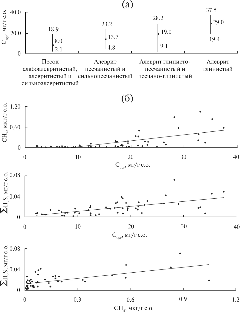 Наблюдается отчетливая зависимость распределения концентраций метана и сульфидной серы от гранулометрического состава донных отложений (табл. 2), что характерно и для других водных объектов (Гарькуша, Федоров, 2010; Федоров и др., 2006, 2007). При этом, если с увеличением доли песчаной фракции (>0.05 мм) концентрации метана и сульфидной серы снижаются (рис. 2а), то с увеличением доли более тонкозернистых фракций (алевритовой и пелитовой размерности) их концентрации, наоборот, возрастают. Причем с пелитовой фракцией (<0.005 мм), доля которой не превышает 8.7% минеральной матрицы исследованных отложений, наблюдается менее тесная положительная связь, чем с фракцией алевритовой размерности (0.05–0.005 мм), доля которой в среднем на порядок больше. Описанная связь между распределением концентраций метана, сульфидной серы и гранулометрическим составом донных отложений выражается, в том числе, в увеличении концентраций данных показателей в направлении «пески → алевриты сильнопесчанистые и песчанистые → алевриты глинисто-песчанистые и песчано-глинистые → алевриты глинистые» (рис. 2б). В этом же направлении увеличивается и количество органического вещества (рис. 3а), которое наряду с содержанием растворенного кислорода в придонном слое воды обычно является основным фактором, лимитирующим скорости метаногенеза и сульфатредукции в донных отложениях (Кузнецов и др., 1985; Федоров и др., 2007; Гарькуша, Федоров, 2010 и др.). Сказанное подтверждается тесными прямолинейными зависимостями между Сорг и концентрациями метана и сульфидной серы (рис. 3б), что характерно и для других водных объектов (Гарькуша, Федоров, 2010; Федоров и др., 2006; 2007).