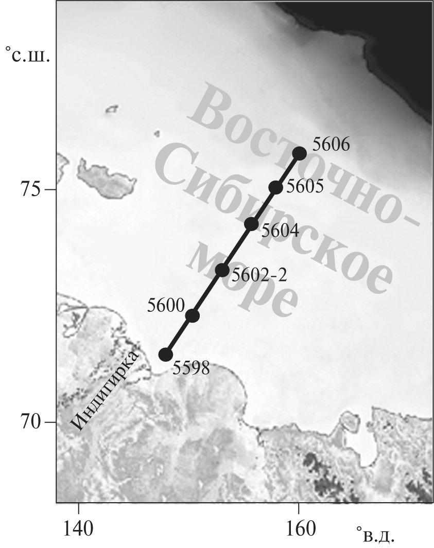 Во время проведения арктического рейса на НИС «Академик Мстислав Келдыш» в 2017 г. был осуществлен пробоотбор образцов донных осадков и газов вдоль меридионального профиля от устья р. Индигирки до границы постоянных льдов. Карта со станциями отбора проб показана на рис. 1. Координаты станций и глубины в точках пробоотбора приведена в табл. 1. Первая станция № 5598 располагалась от берега на расстоянии 50 км. Расстояние между станциями 5598 и 5606 составляло 550 км. Расстояние до дна в точках отбора морских осадков изменялось от 13 до 48 м.