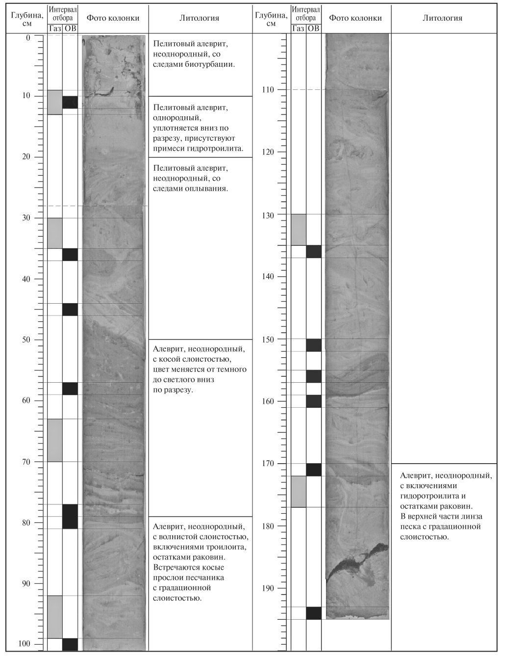 В верхней части (0–15 см) осадок несет явные следы биотурбации. Он представляет собой комковатый пелитовый алеврит с многочисленными ходами бентосной фауны. Осадок слабо литифицирован. Активная биотурбация свидетельствует об аэробном режиме в верхней части осадка. Ниже осадок становится более однородным, на глубине около 20 см ниже дна наблюдаются примазки гидроилита. Появление гидроилита свидетельствует о зарождающейся сульфат-редукции и появлении S2- иона в осадке, образующегося в результате восстановления сульфат-иона:
