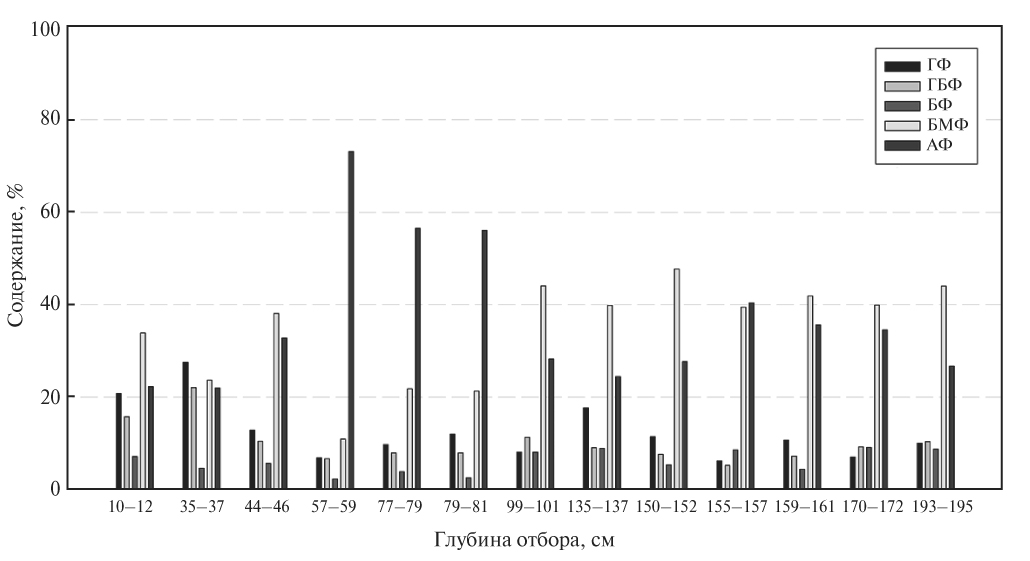 ИФХ ОВ, полученные по вертикальному профилю осадка, отобранного на станции 5602-2, представлены на рис. 7. Вид ИФХ изменяется в зависимости от глубины пробоотбора из колонки осадка. Уже в интервале пробоотбора 35–37 см вся ИФХ ОВ смещается в область с пониженным содержанием тяжелого изотопа 13С, и δ13С(Г) становится меньше δ13С(ГБ). В более глубоких слоях керна вид ИФХ ОВ изменяется еще сильнее, особенно в зоне сульфат-редукции. Так, ИФХ ОВ, находящегося в слое керна на глубине отбора 44–46 см вблизи зоны сульфат-редукции, сильно отличается от ИФХ ОВ в предыдущем слое (35–37 см) и от ИФХ ОВ следующего слоя керна (57–59 см), находящегося в зоне сульфат-редукции. Структура керна в интервале 77–81 см является неоднородной, с косым волнистым переслаиванием тонких слойков более светлого тона на более темном фоне. Поэтому ИФХ ОВ, находящегося в этом слое керна (79–81 см), имеет измененную форму и необычный изотопный состав ГБ и Б. Также ИФХ ОВ имеют искаженный вид для более глубоких слоев керна (155–157 см, 159–161 см, 170–172 см), так как керн в этих слоях имеет неоднородную и волнистую структуру.