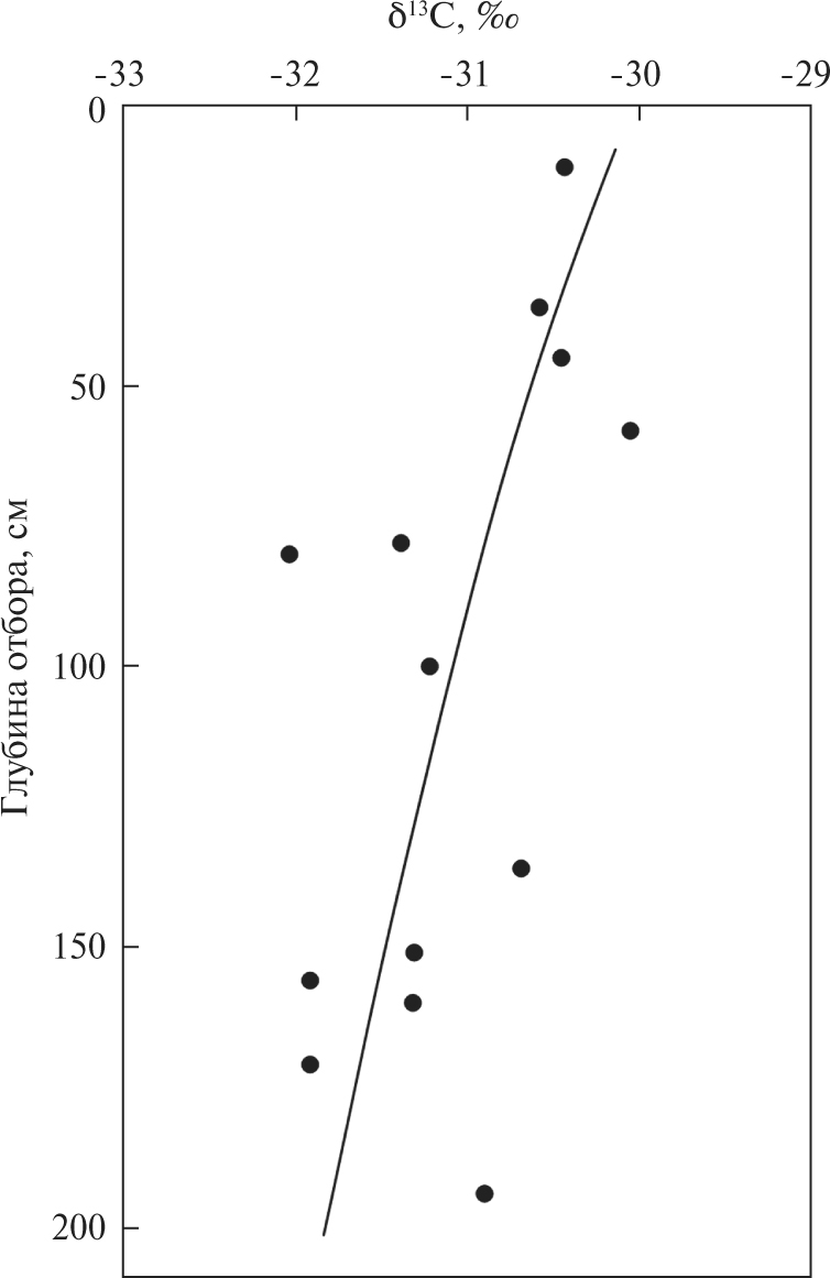 Развитие процесса сульфат-редукции приводит к окислению органического углерода и увеличению содержания СО2, причем образующийся СО2 обогащен легким изотопом. В результате наблюдается смещение изотопного состава окисленного углерода (СО2) в осадке в сторону более отрицательных значений δ13С с глубиной на 1–1.5‰ (рис. 5).